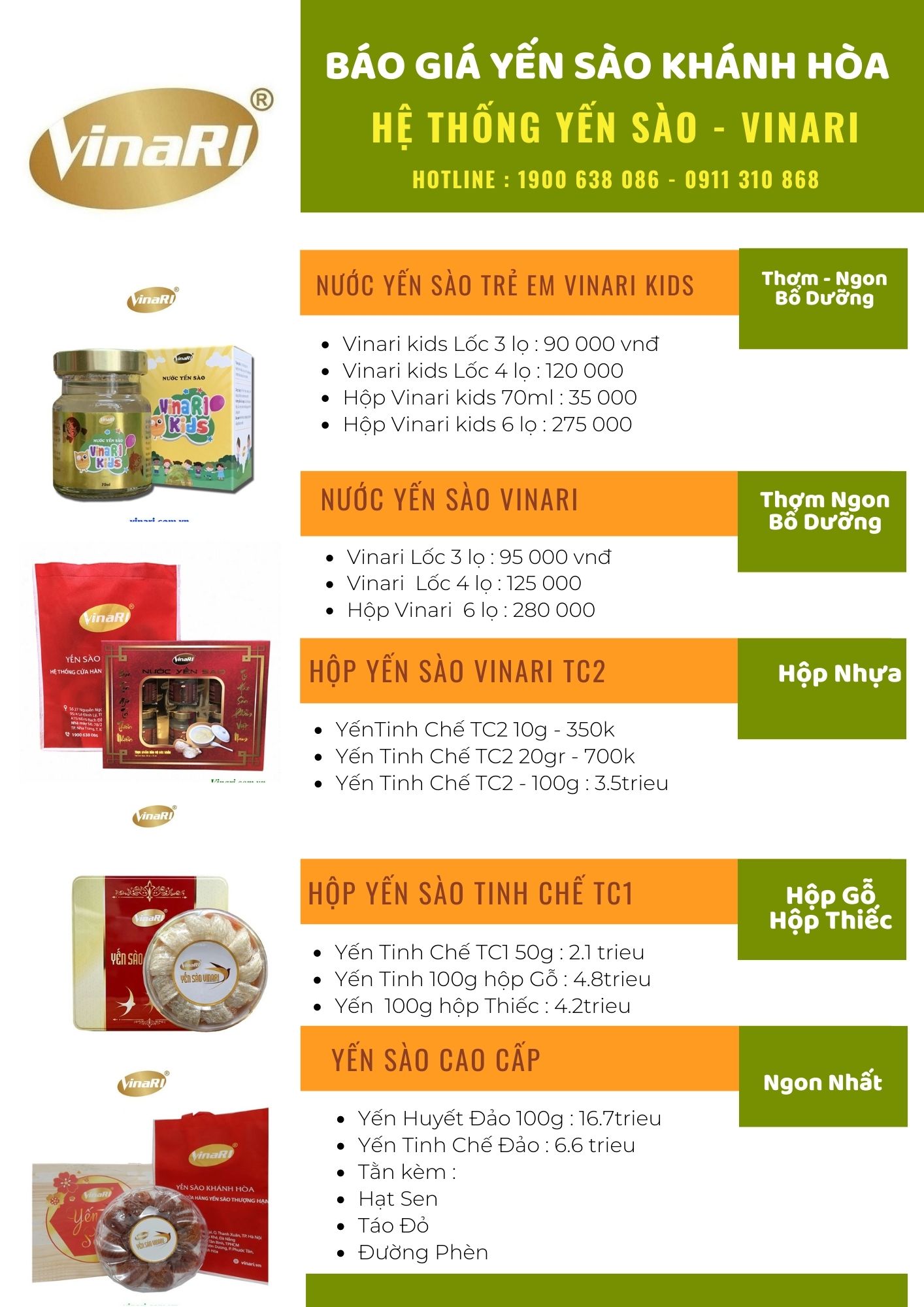 Bảng giá yến sào Khánh Hòa thương hiệu VinaRI