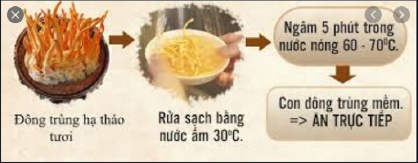Lưu ý: Không rửa Đông trùng Hạ thảo, không dùng nhiệt độ quá 70 độ C và tránh ánh sáng trực tiếp vì sẽ làm giảm hoạt chất