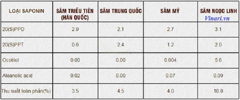 Bảng so sánh Sâm Ngọc Linh với các loại sâm khác, có thể thấy hoạt chất dược tính trong sâm ngọc linh hoàn toàn vượt trội