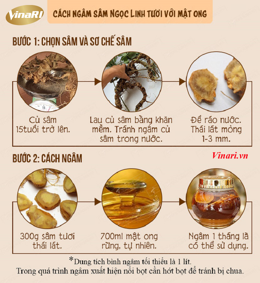 rửa củ sâm thật sạch, cắt lát mỏng. Sau đó xếp từng lát sâm vào bình bằng thủy tinh, đổ mật ong ngập những lát sâm rồi đậy kín nắp và để trong vòng khoảng 1 tháng là có thể dùng được.