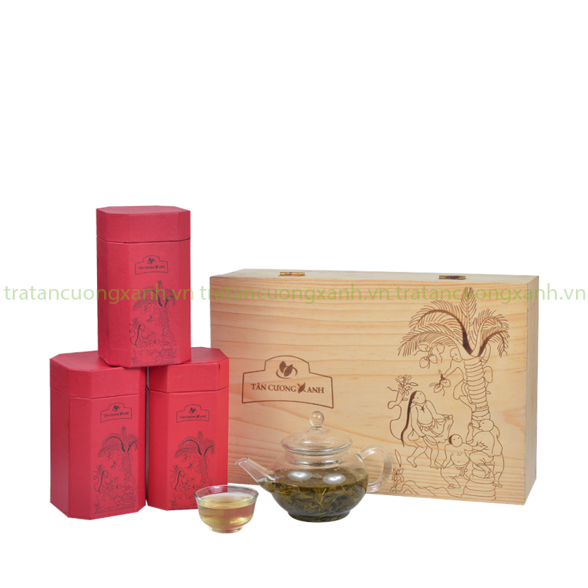 Mô tả : Trà sen tây hồ được sản xuất trên nguyên liệu là búp trà đinh và gạo sen tây hồ. Sản phẩm được hút chân không và đựng trong 3 hộp giấy carton nhỏ và đựng trong hộp gỗ thông trắng đẹp